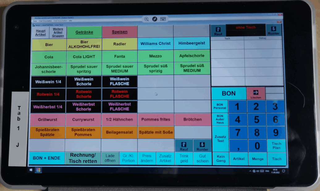 In einem WLAN (das wir aufbauen) arbeitet jede Bedienung mit einem eigenen 8"-Tablet. Die Bons zu den Bestellungen werden über WLAN direkt in Küche, Theke usw. ausgedruckt (bis zu 6 Drucker sind möglich).